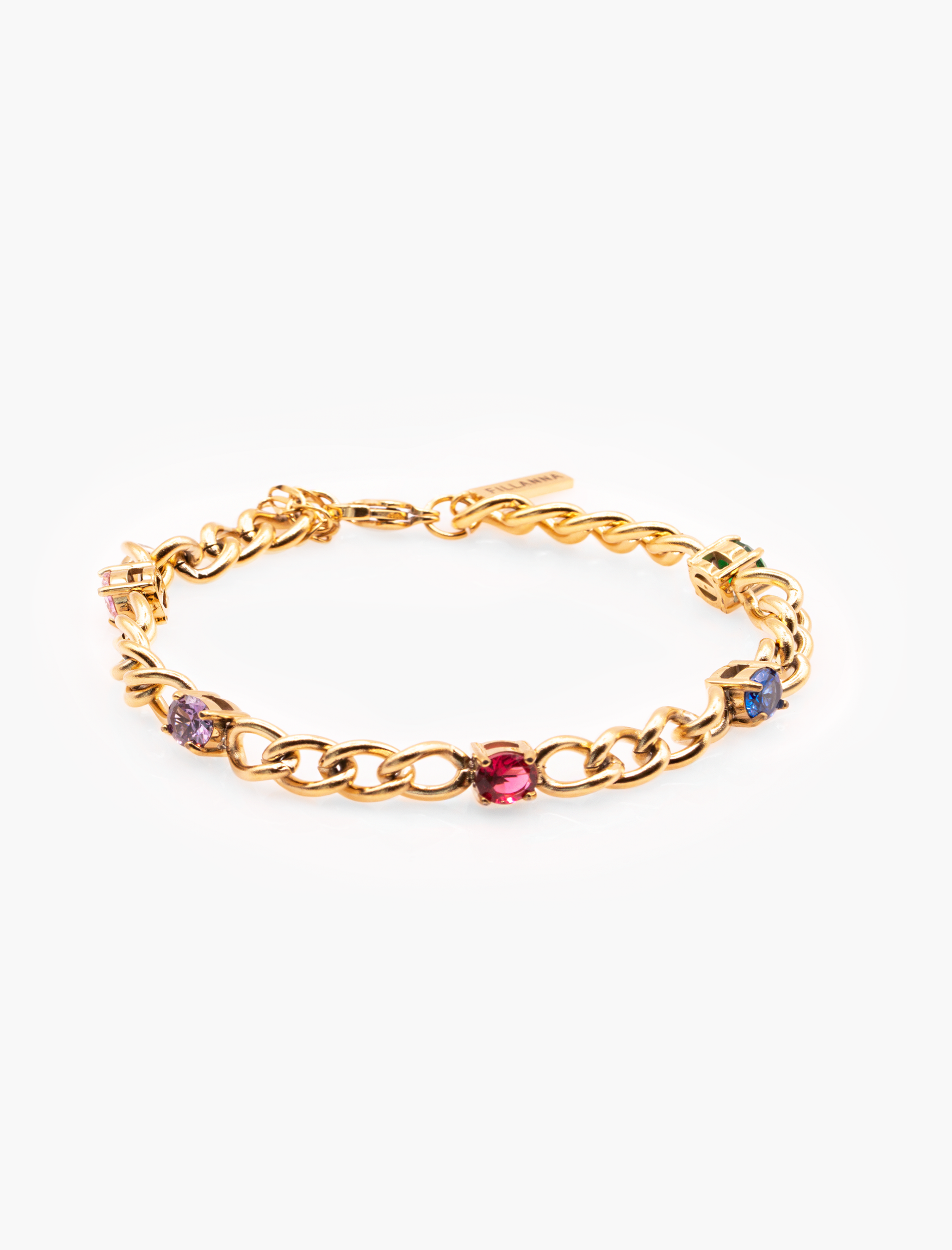 Elegantes Armband mit feinem Goldglanz und dezenten, farbigen Akzenten. Die klassische Gliederkette wird durch zart eingefasste Schmucksteine in verschiedenen Farben veredelt und verleiht dem Design eine spielerische, feminine Note.