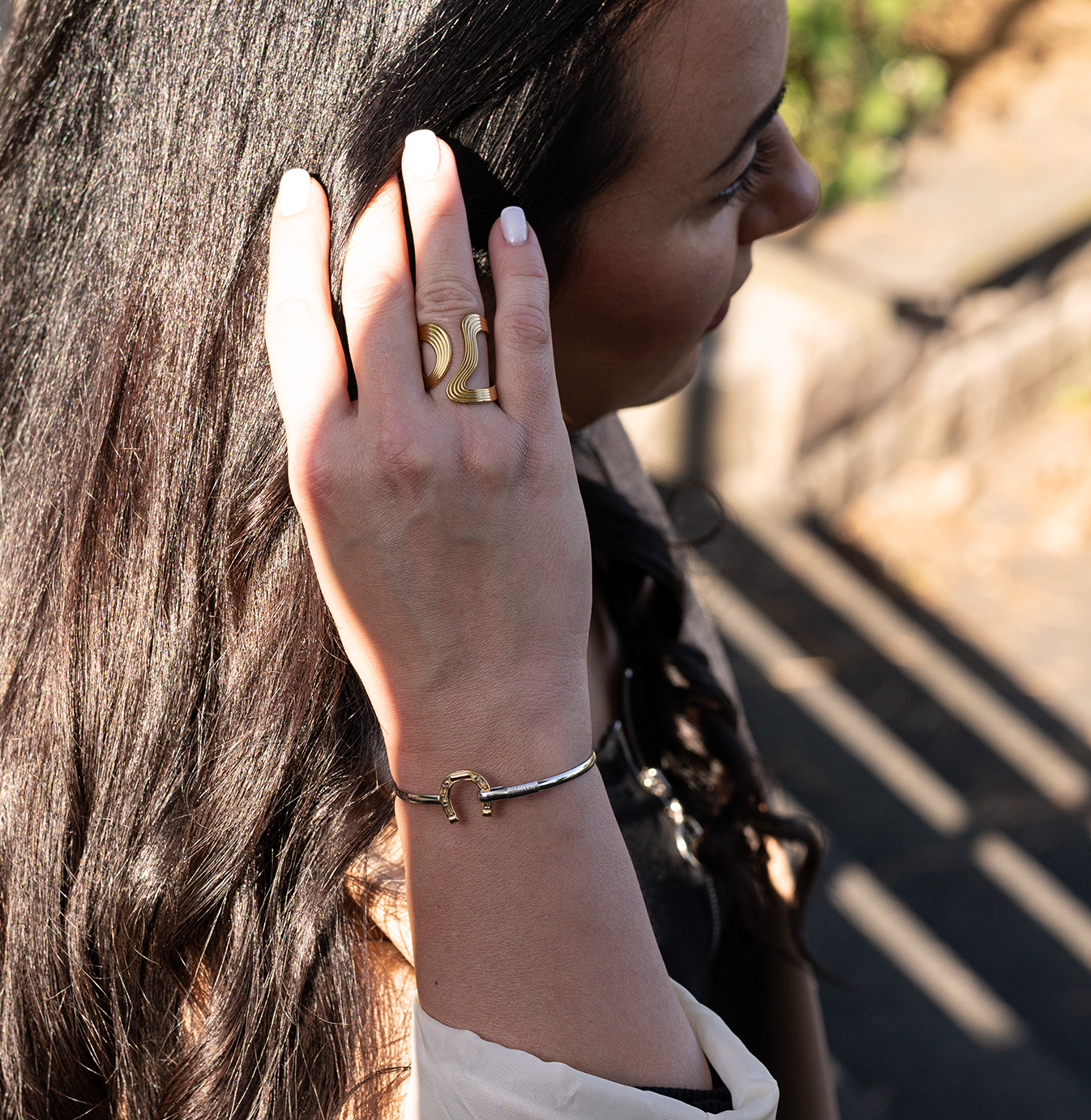Das geschwungene Design mit feinen Linien bringt Bewegung und Eleganz in jeden Look – ein modernes Schmuckstück mit architektonischem Flair.