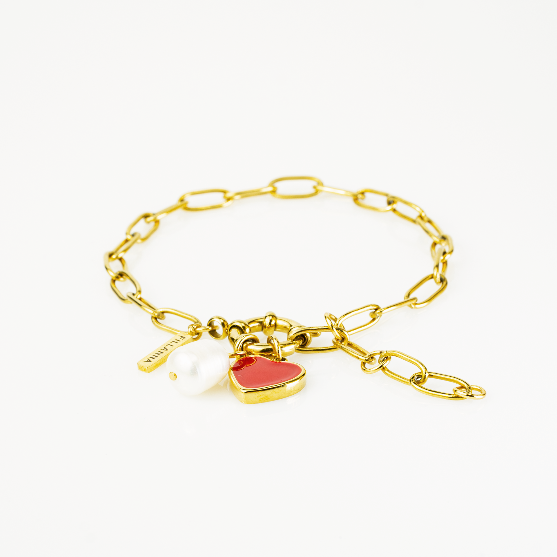 Ein feines Charm-Armband mit spielerischen Details: Mini-Coin, kleiner Würfel und ein rotes Herz als Blickfang. Gefertigt aus hochwertigem Edelstahl 316L und mit 18K Gold veredelt – wasserresistent, hypoallergen und angenehm leicht. Perfekt für den Alltag oder als liebevolles Geschenk.