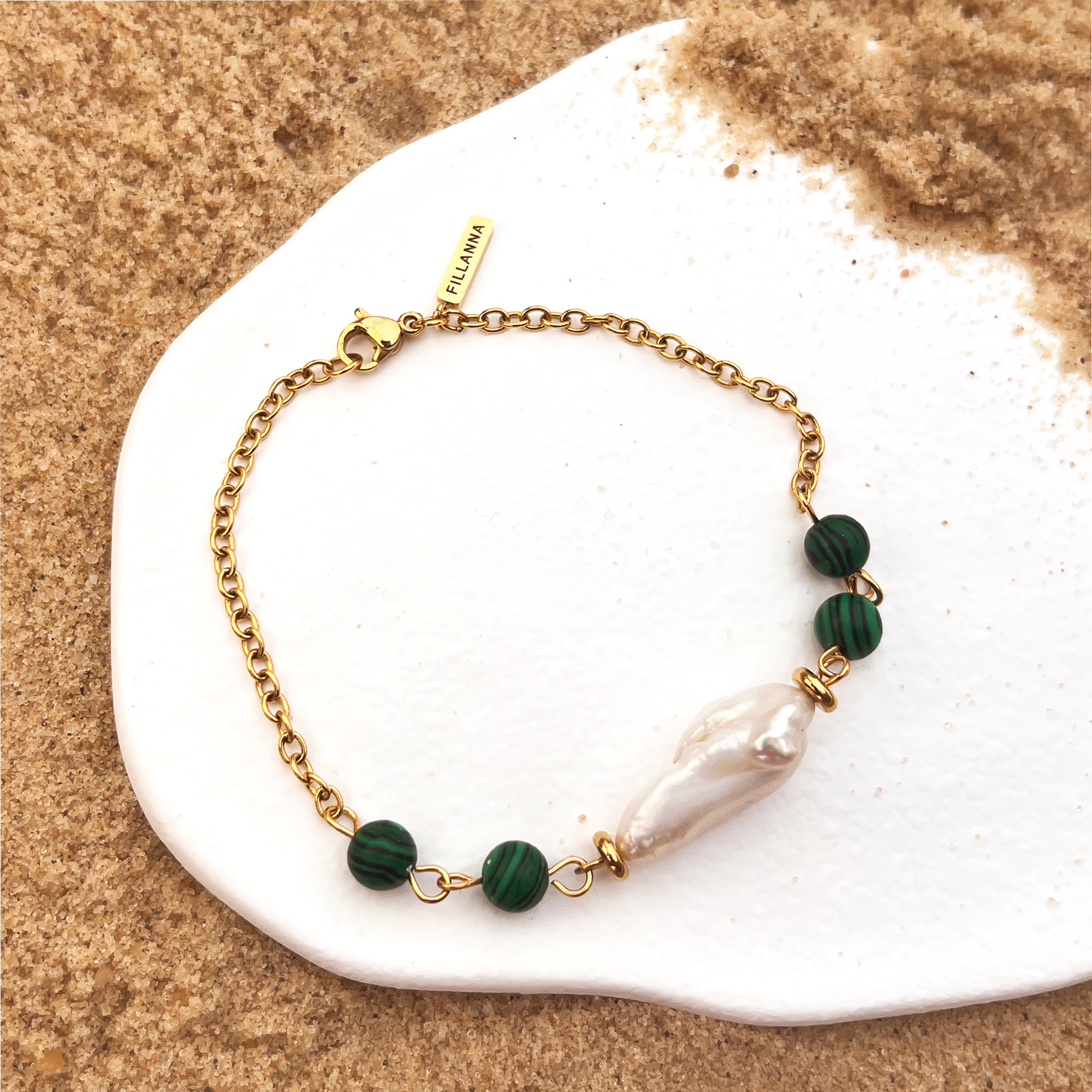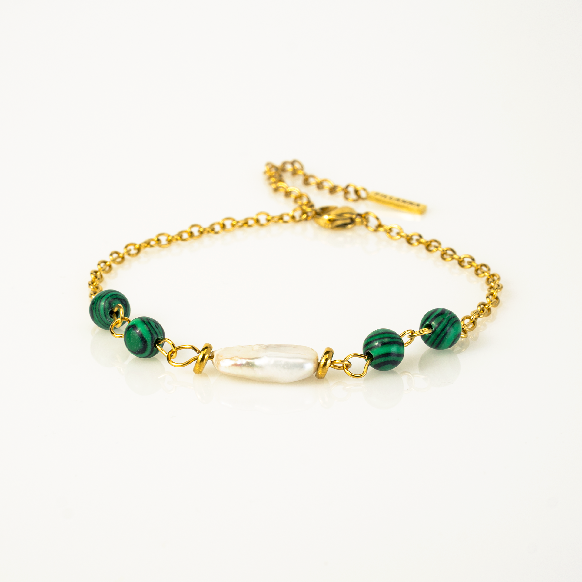 Zartes Armband mit goldener Kette: Im Mittelpunkt steht eine weiße Naturperle, flankiert von grünen Schmuckperlen (synthetisch, nicht aus Glas/Stein). Gefertigt aus hochwertigem Edelstahl 316L und mit 18K Gold veredelt – wasserresistent, hypoallergen und angenehm leicht. Perfekt fürs Layering oder als feiner Akzent im Alltag.