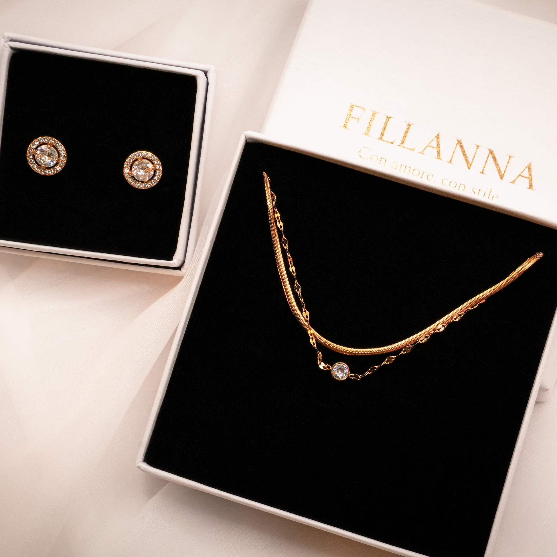 Beide Stücke sind mit funkelnden Zirkonia-Steinen verziert, die das Licht bei jeder Bewegung sanft reflektieren und ein Gefühl von Raffinesse und Weiblichkeit verleihen.
