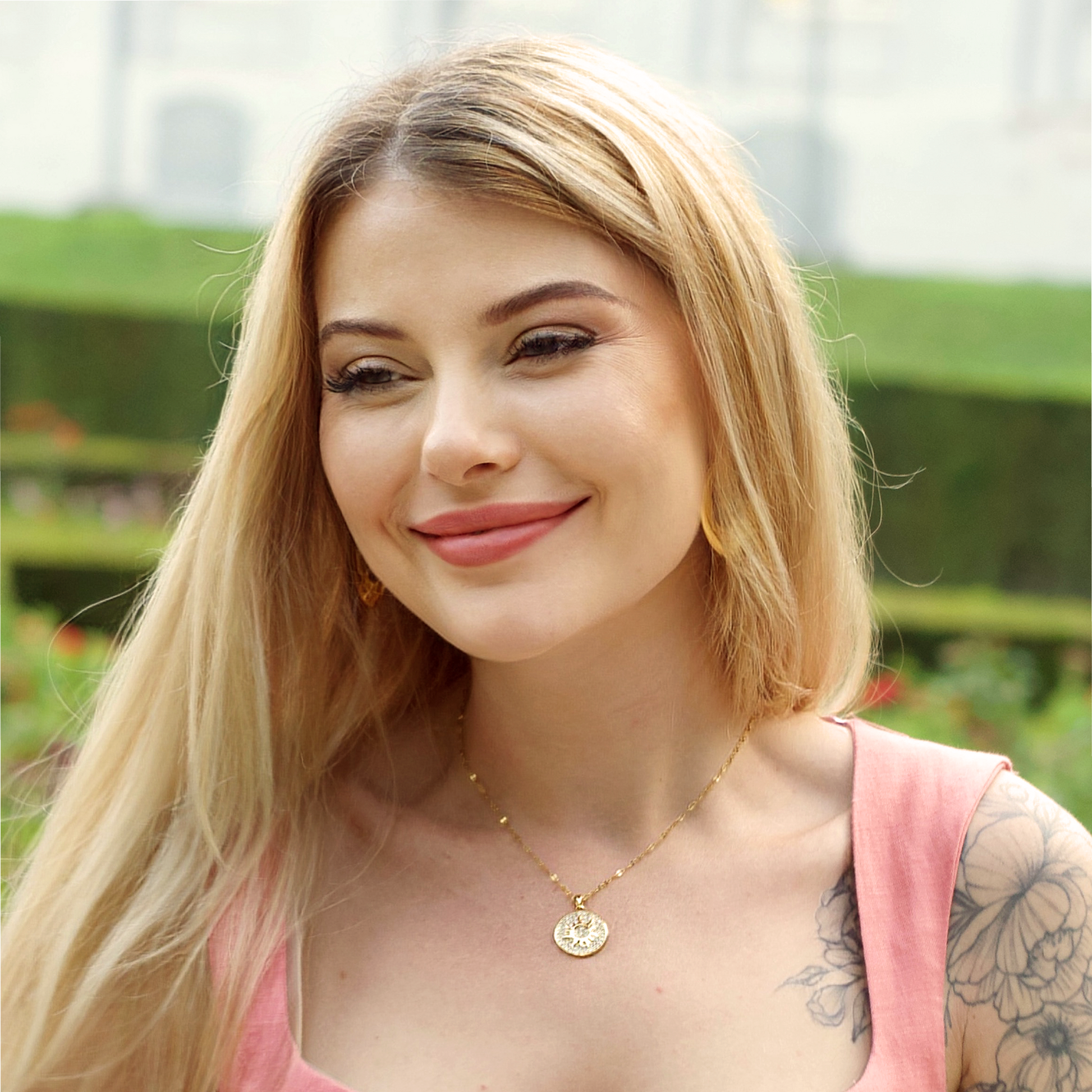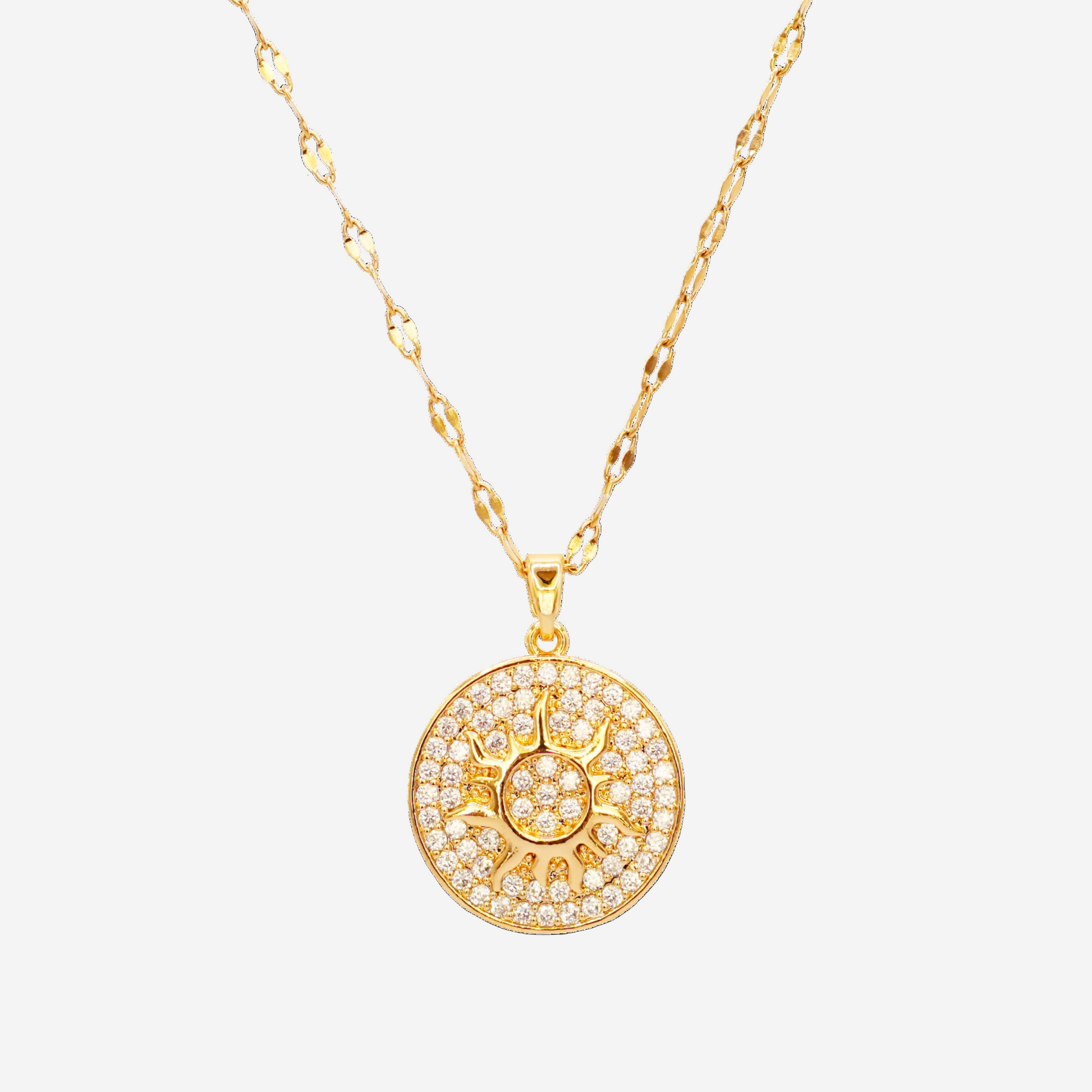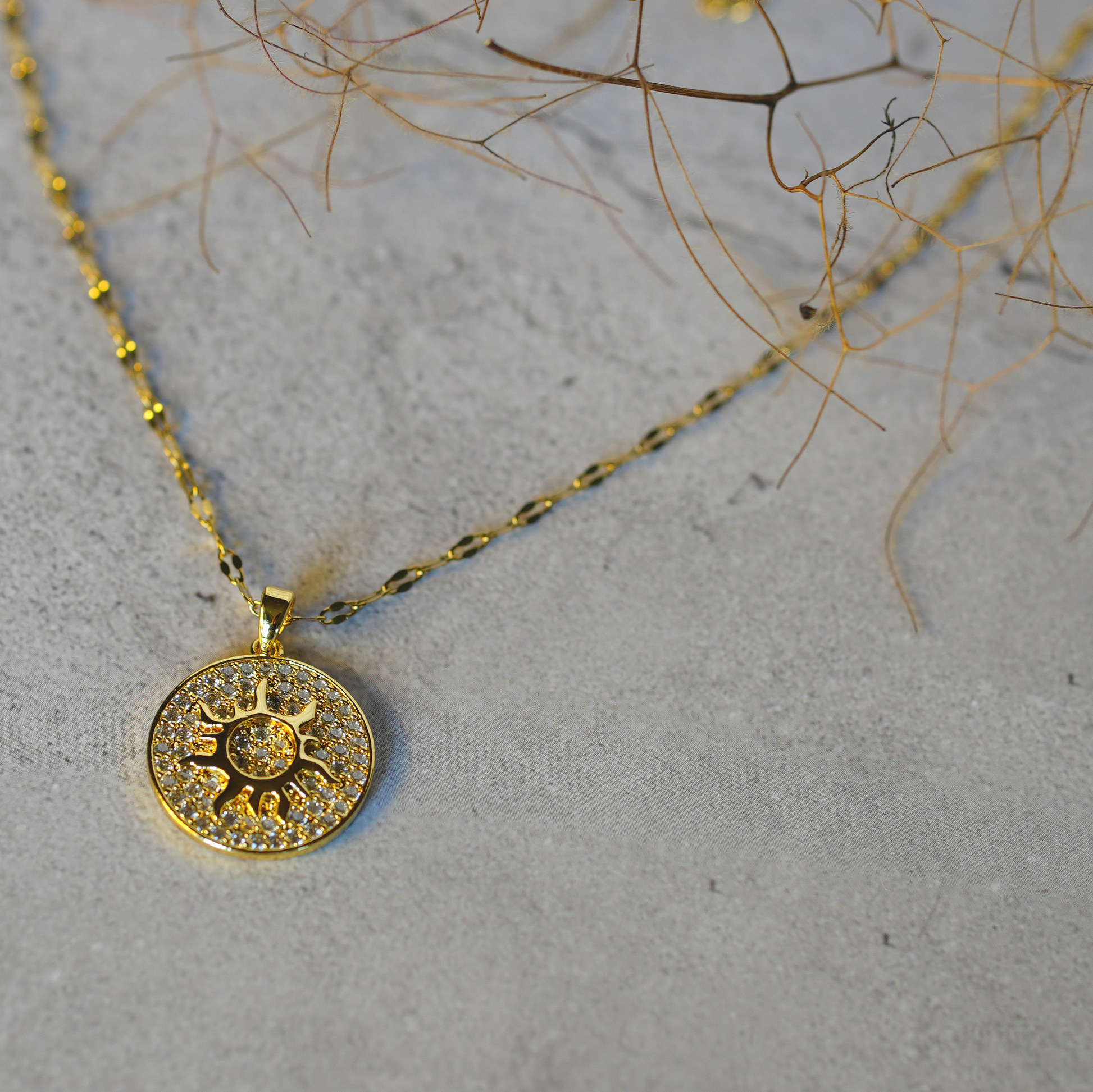 Zarte Halskette mit goldenem Sonnen-Medaillon: Im Zentrum funkeln Steine, die das Licht wunderbar einfangen. Gefertigt aus hochwertigem Edelstahl 316L und mit 18K Gold veredelt – wasserresistent, hypoallergen und ideal für empfindliche Haut.