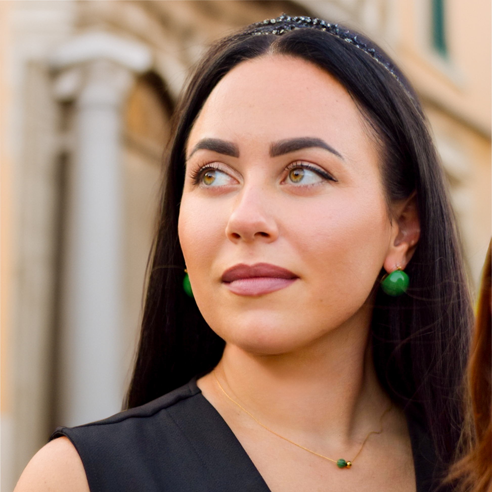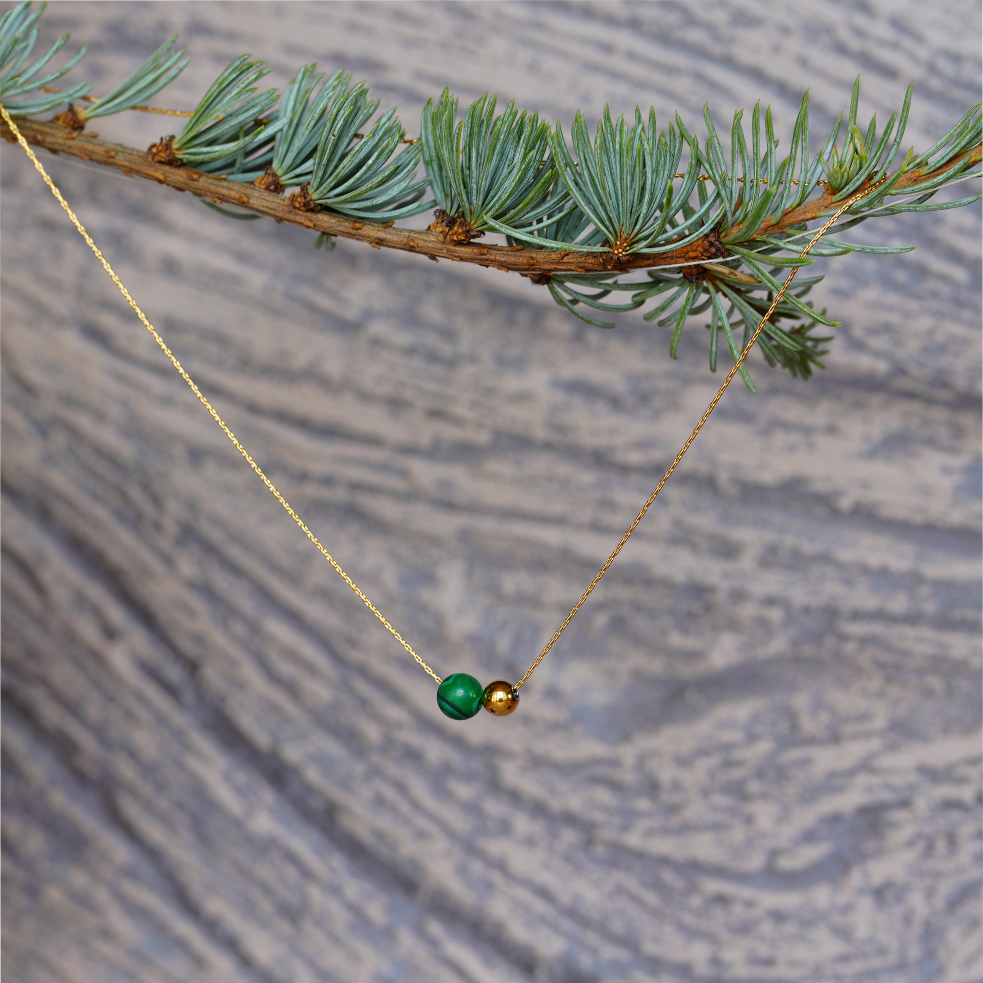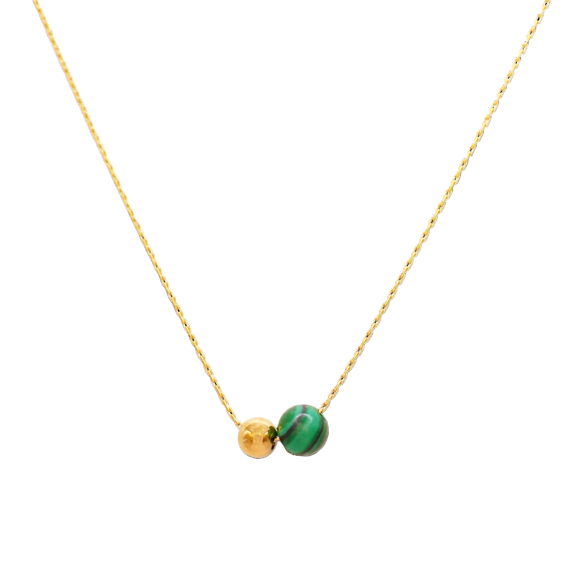 Feine Halskette mit minimalistischem Duo: ein glänzendes Goldplättchen und ein runder grüner Schmuckstein, der das Licht sanft einfängt. Gefertigt aus hochwertigem Edelstahl 316L und mit 18K Gold veredelt – wasserresistent, hypoallergen und ideal fürs Layering.