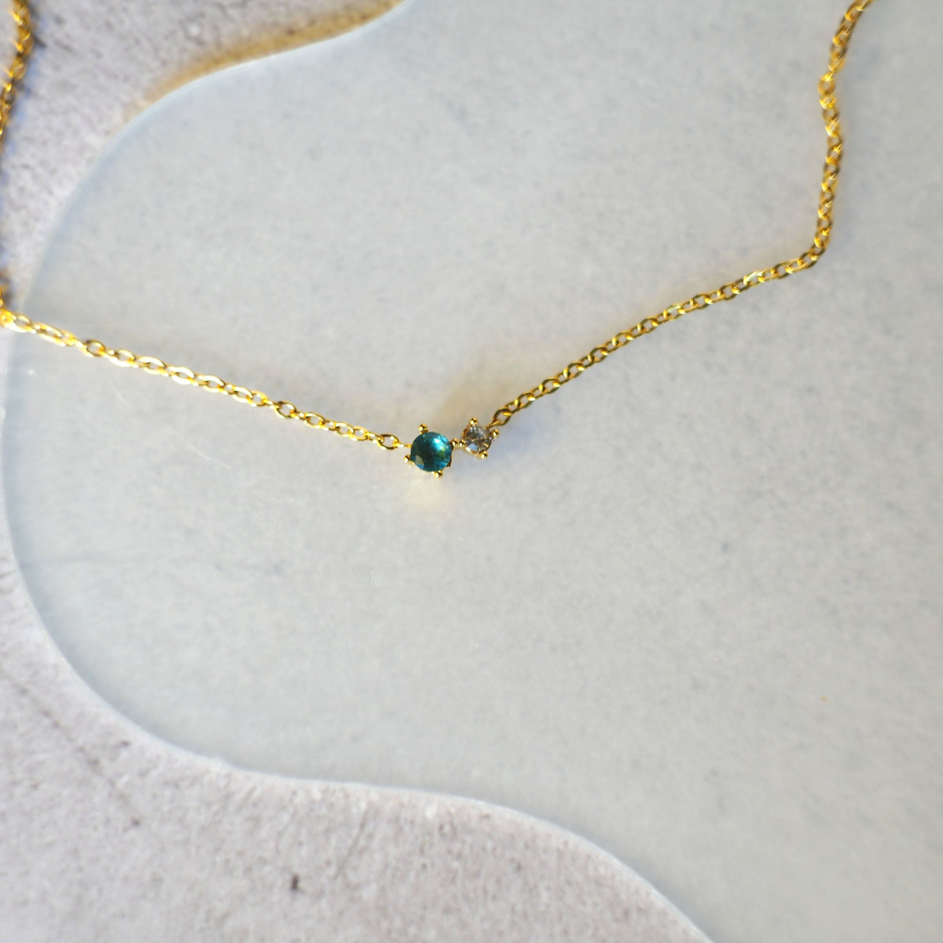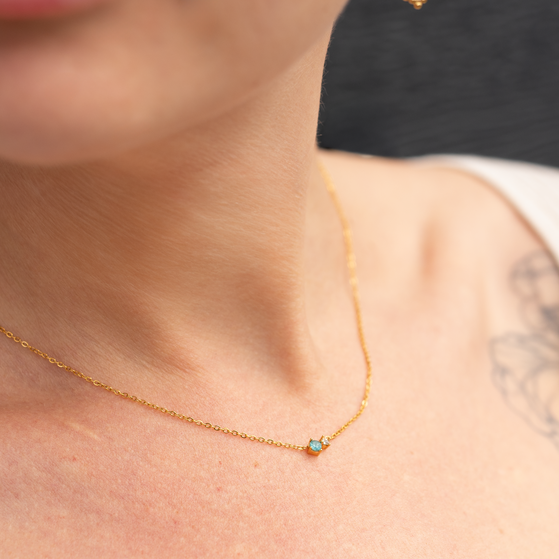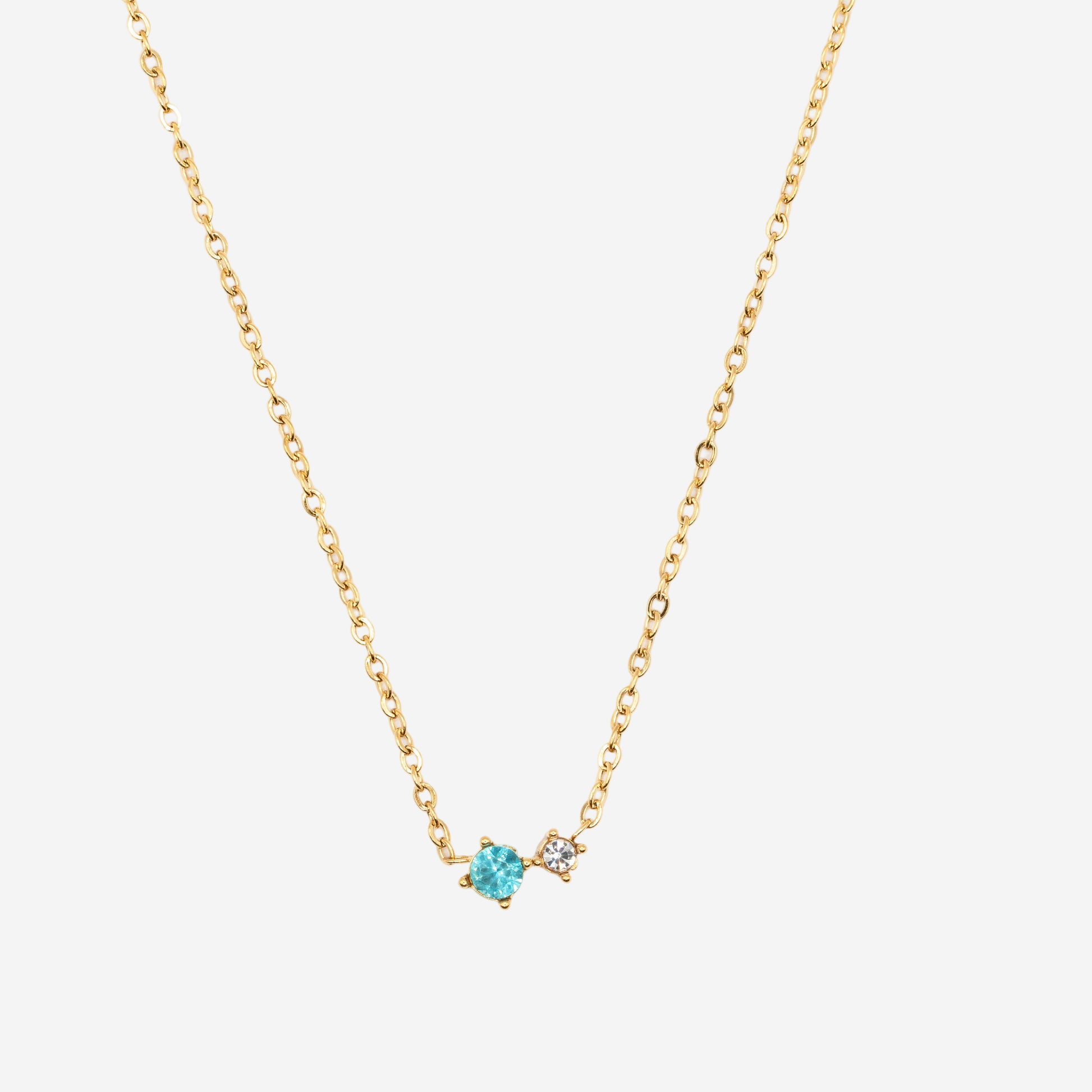 Feine, vergoldete Kette mit zwei funkelnden Zirkonia-Steinen im Duo-Look: türkis und klar. Minimalistisch, leicht und ideal fürs Layering. Gefertigt aus hochwertigem Edelstahl 316L und mit 18K Gold veredelt – wasserresistent und hypoallergen.