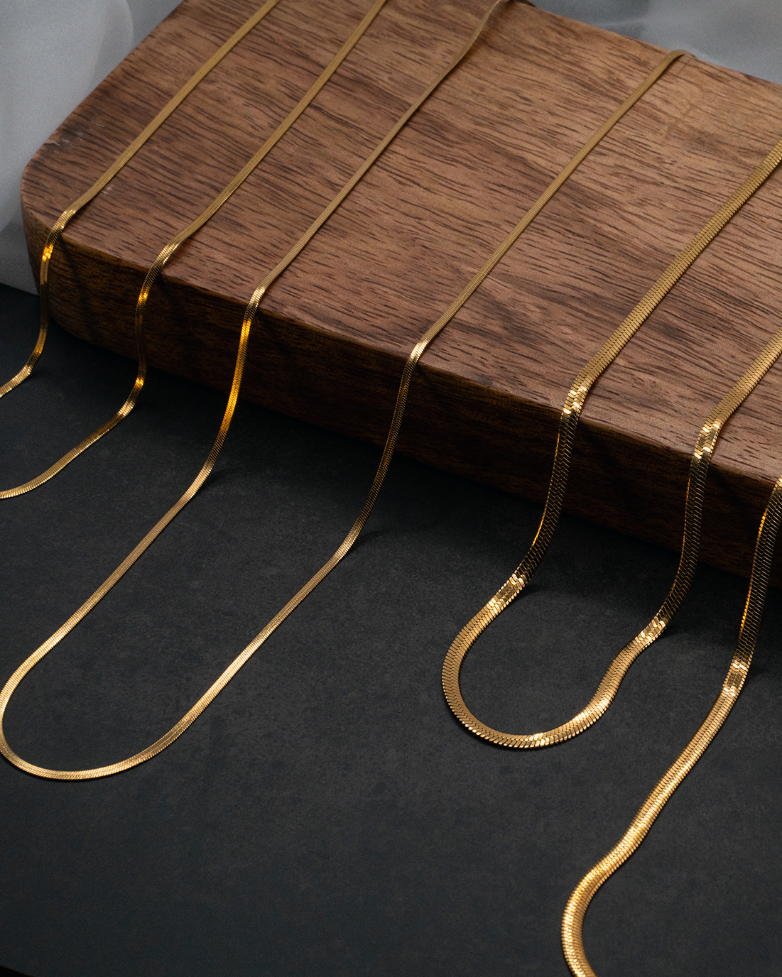 Details • Material: Edelstahl 316L, vergoldet • Breite: 3 mm • Längen: 44 cm und 50 cm • Farbe: Gold • Eigenschaften: wasserresistent & hypoallergen (nickelfrei)