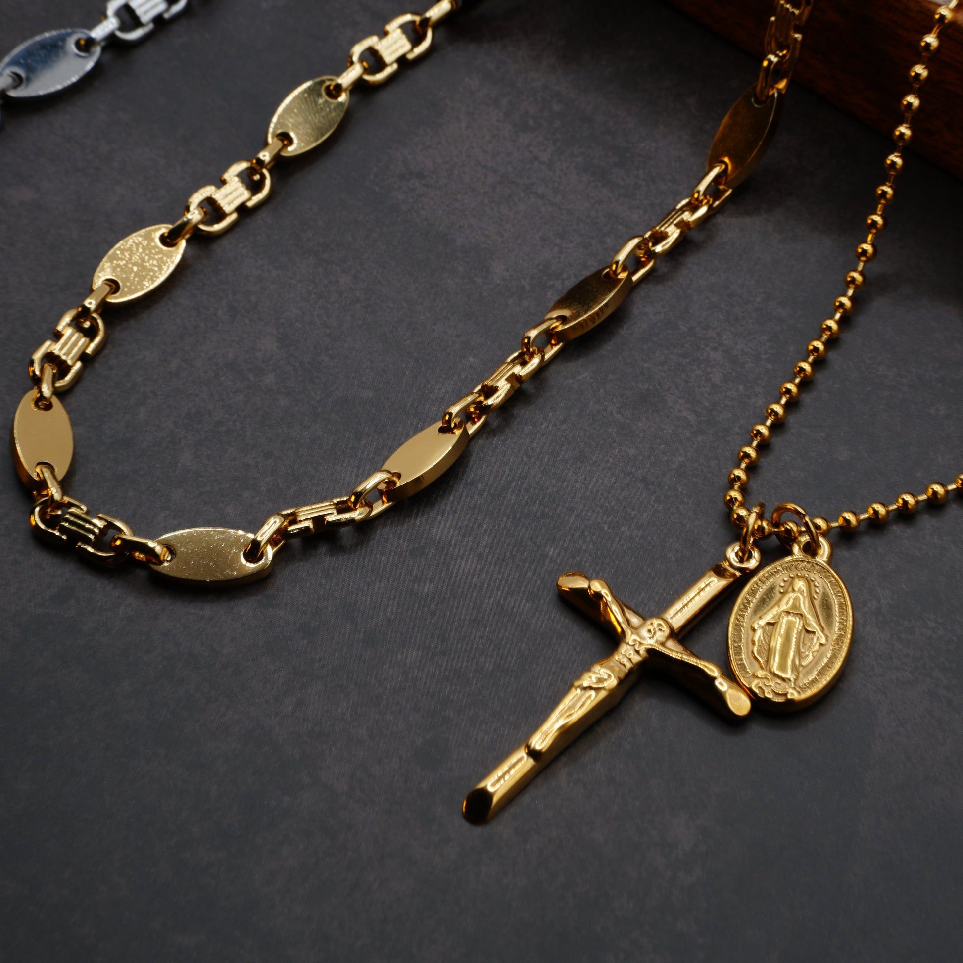 Zeitloses Statement: Vergoldete Herren-Halskette mit Kreuz-Anhänger und ovaler Medaille. Aus robustem 316L Edelstahl, 18K vergoldet – hautfreundlich, wasserresistent und farbbeständig. Perfekt für jeden Tag oder als Layering-Piece.