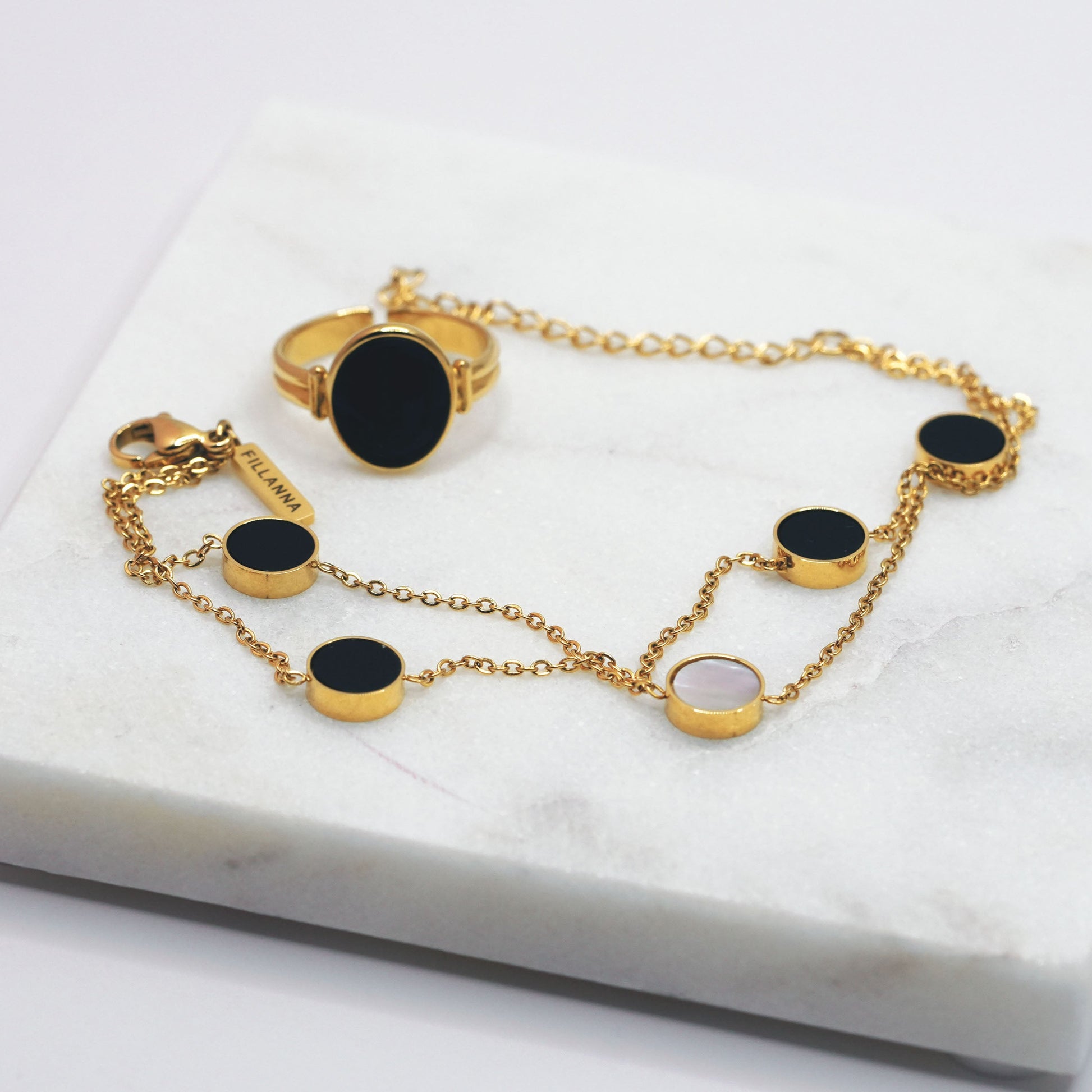Elegantes Set aus vergoldetem Edelstahl mit tiefschwarzen Einlagen.