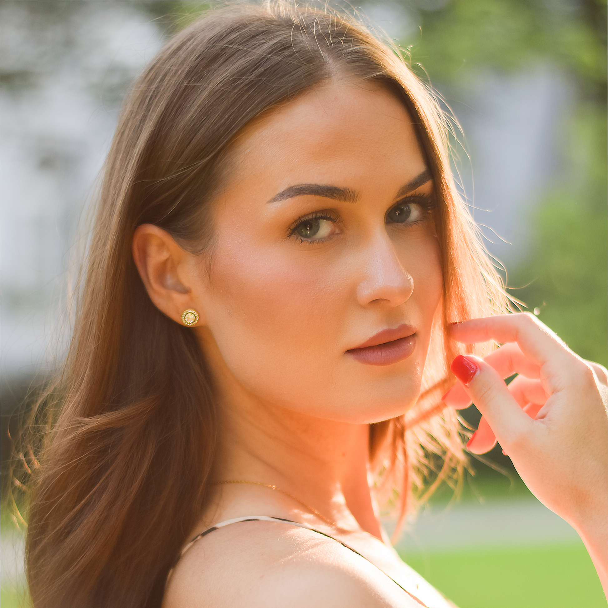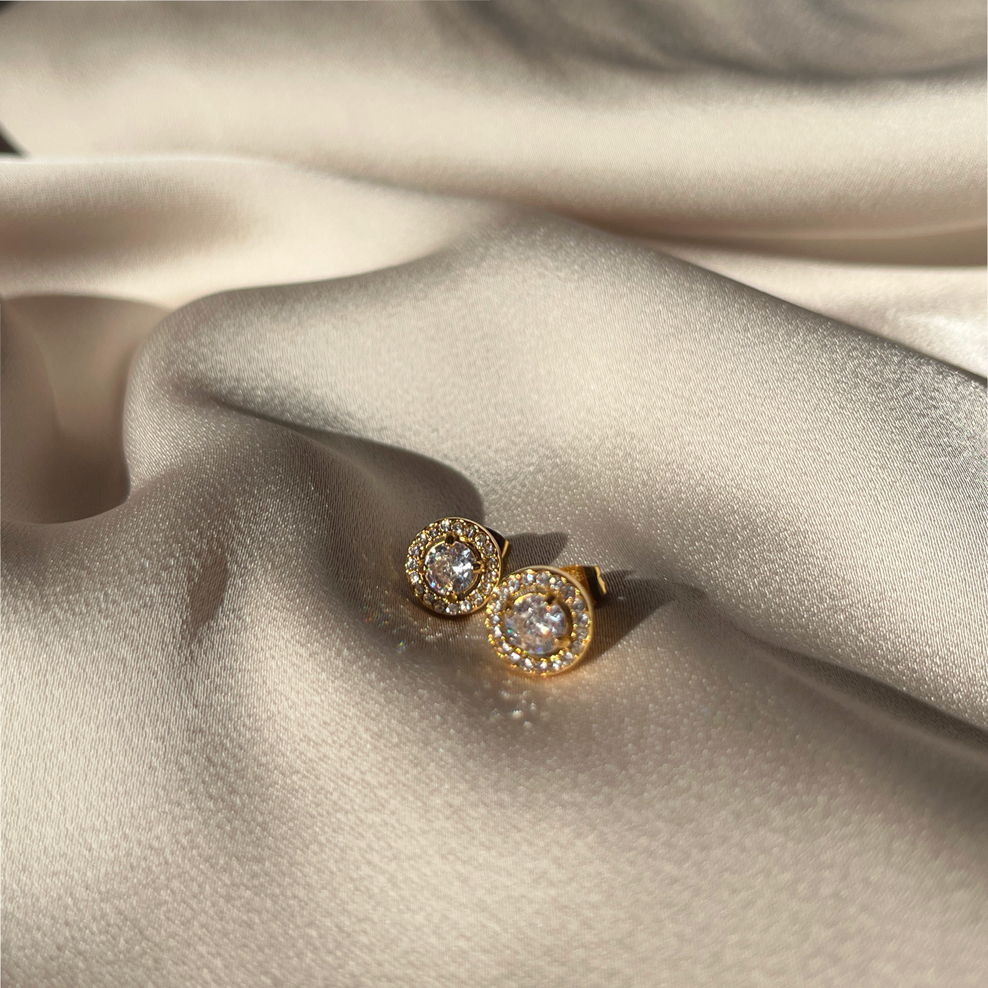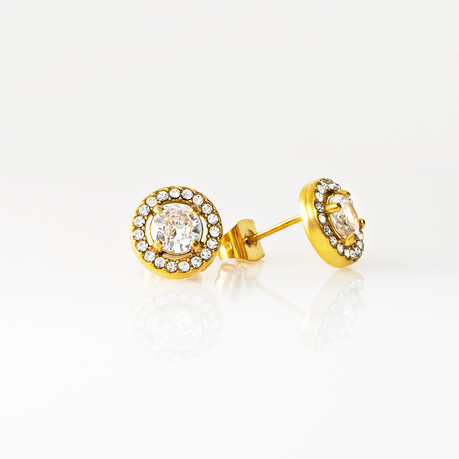 Zarte Essenza-Ohrstecker mit zeitloser, runder Silhouette. Der fein gefasste Pavé-Rand aus klaren Kristallen (Zirkonia) fängt das Licht bei jeder Bewegung ein, während die 18K-Vergoldung auf Edelstahl 316L für langlebenden Glanz sorgt. Leicht, angenehm zu tragen und perfekt zum Layern – von Casual bis Abend.