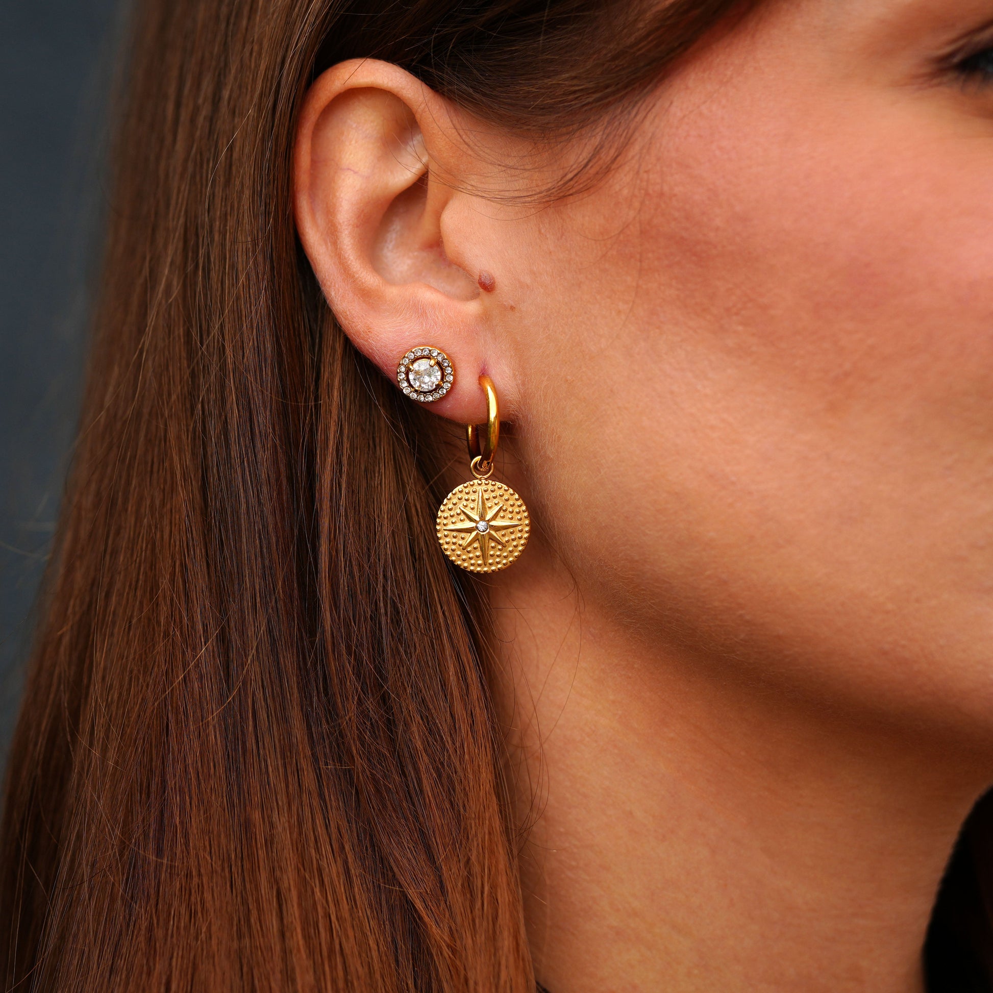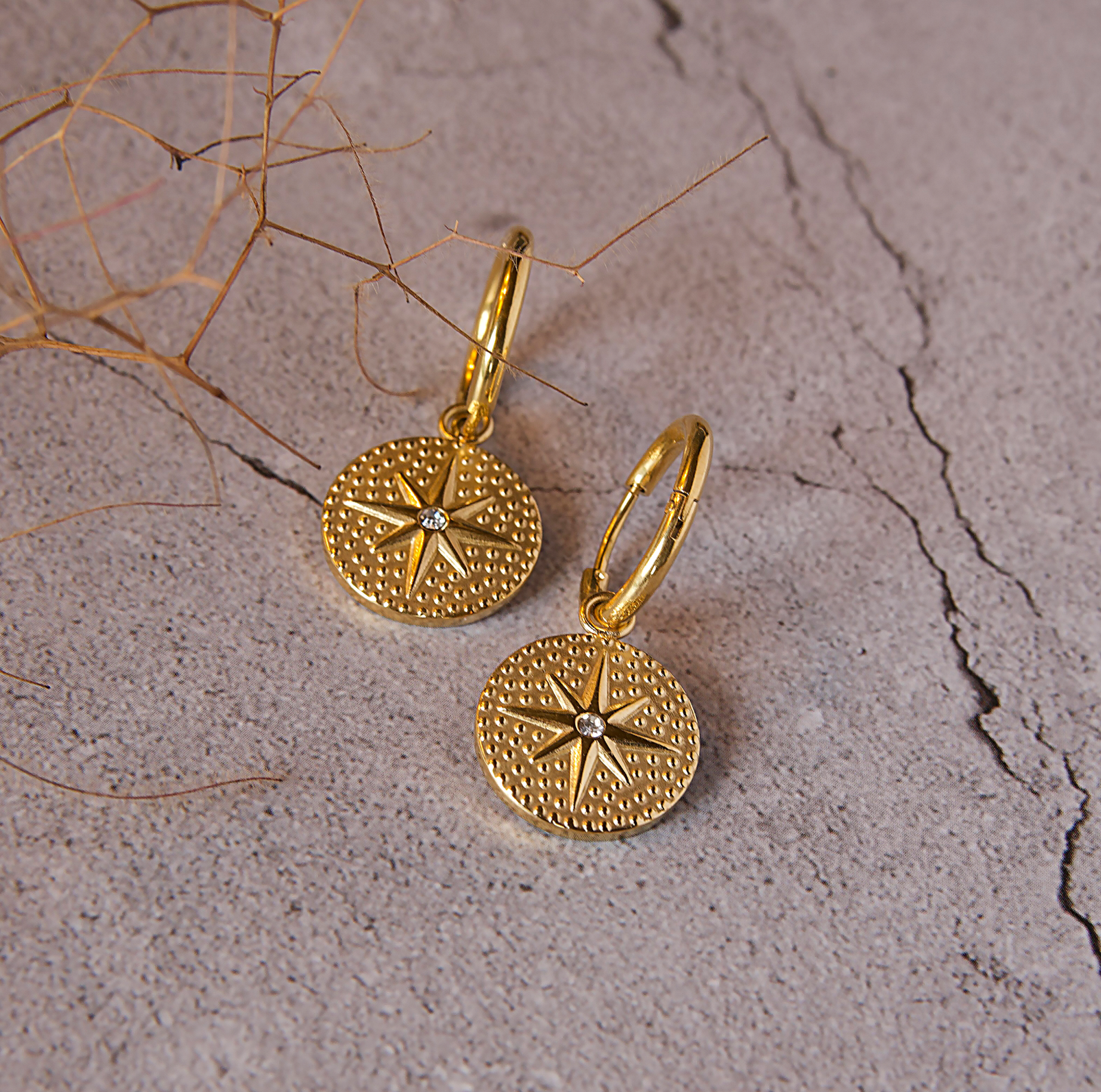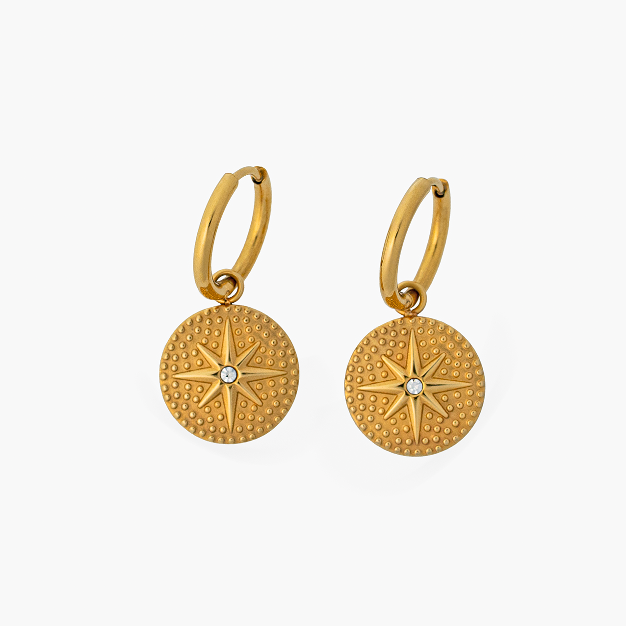 Zeitlose, leichte Creolen mit runden Medaillon-Anhänger: geprägtes Kompass-Motiv und feine Perlenkante sorgen für dezenten Glanz – perfekt für jeden Tag oder als kleines Statement.
