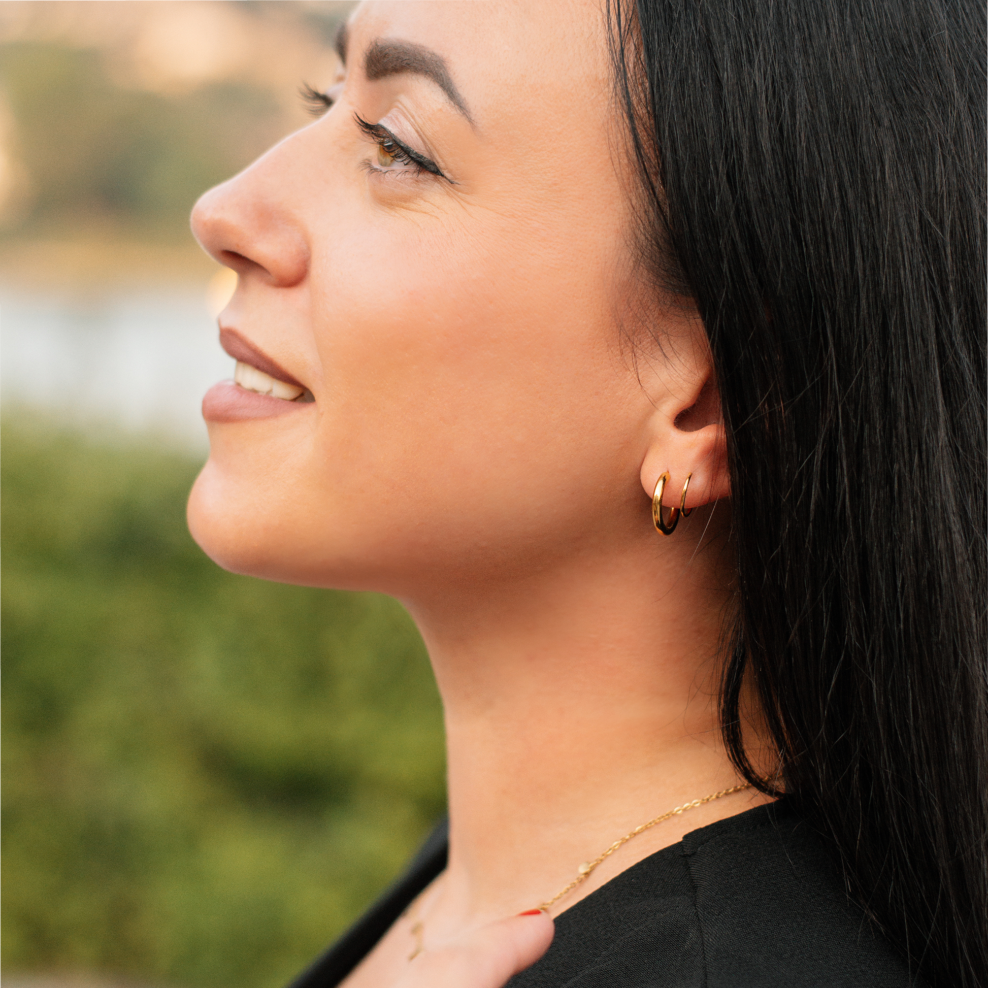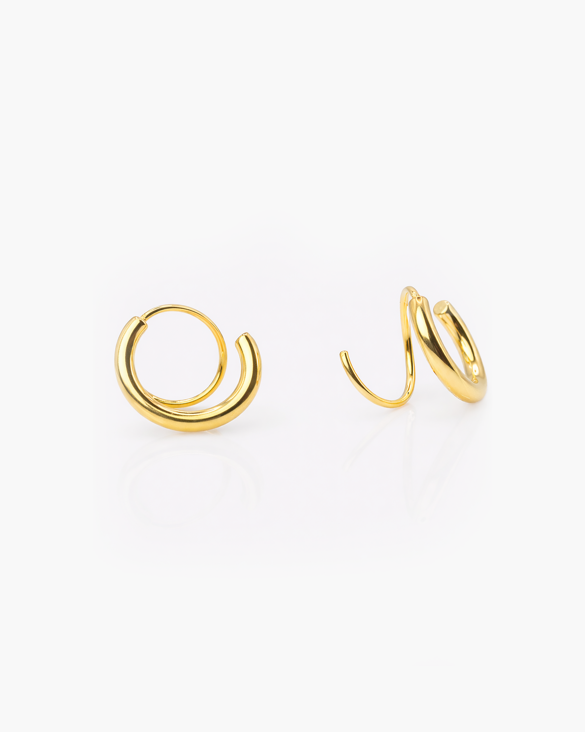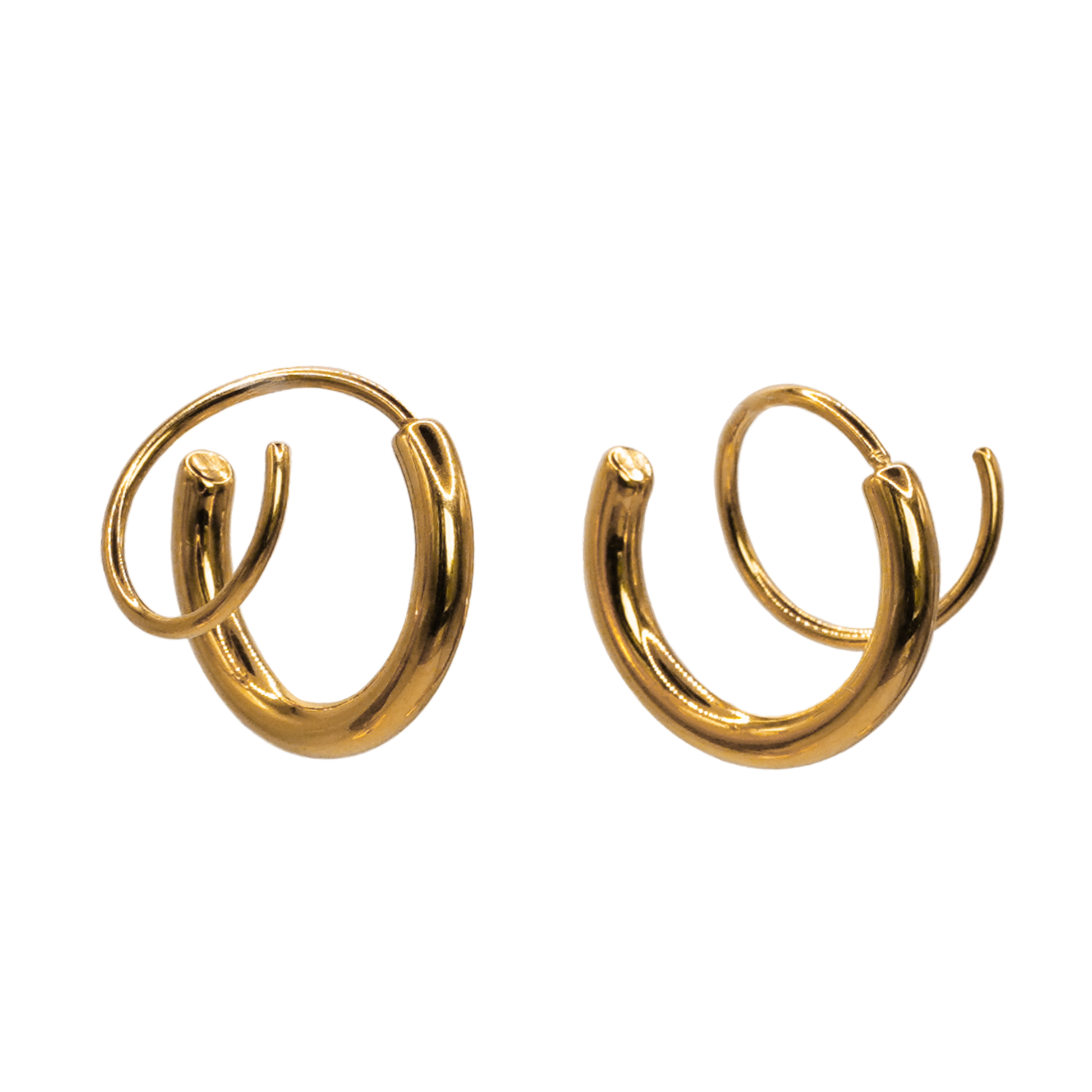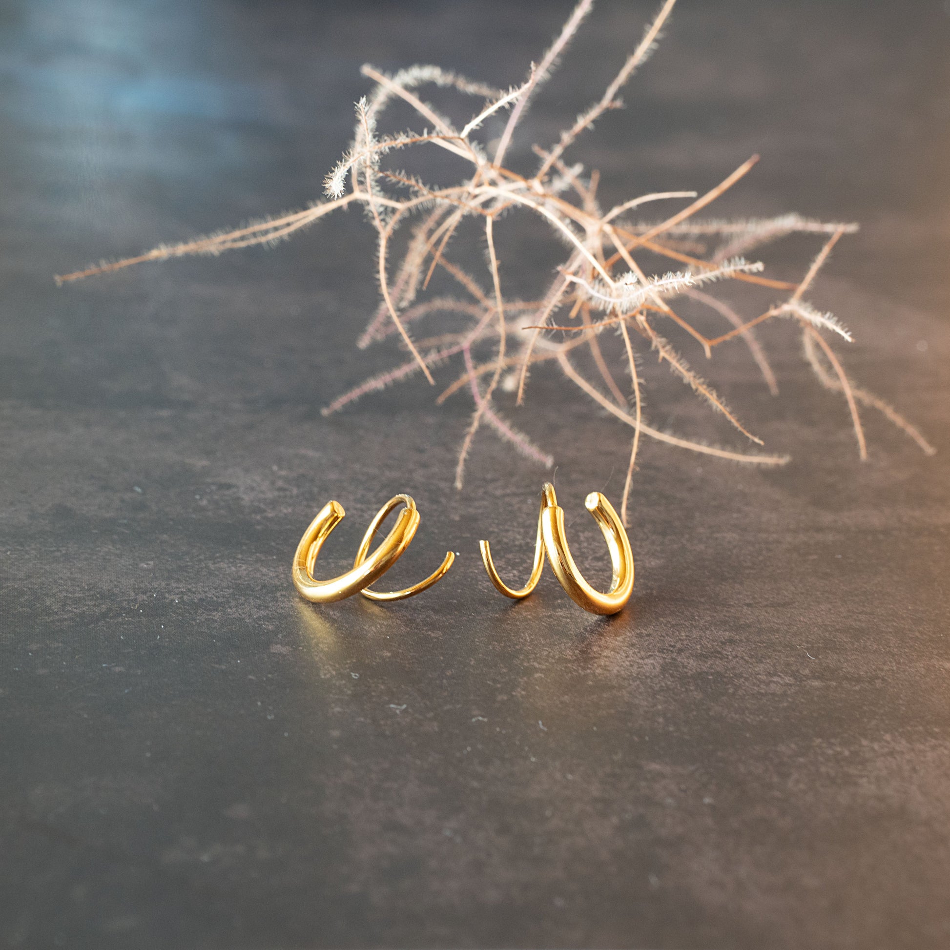 Zarte, aber auffällige Creolen: zwei geschwungene Reifen treffen sich vorn in einer eleganten Knoten-Optik. Leicht, angenehm zu tragen und perfekt für jeden Tag – solo oder im Ear-Stack.