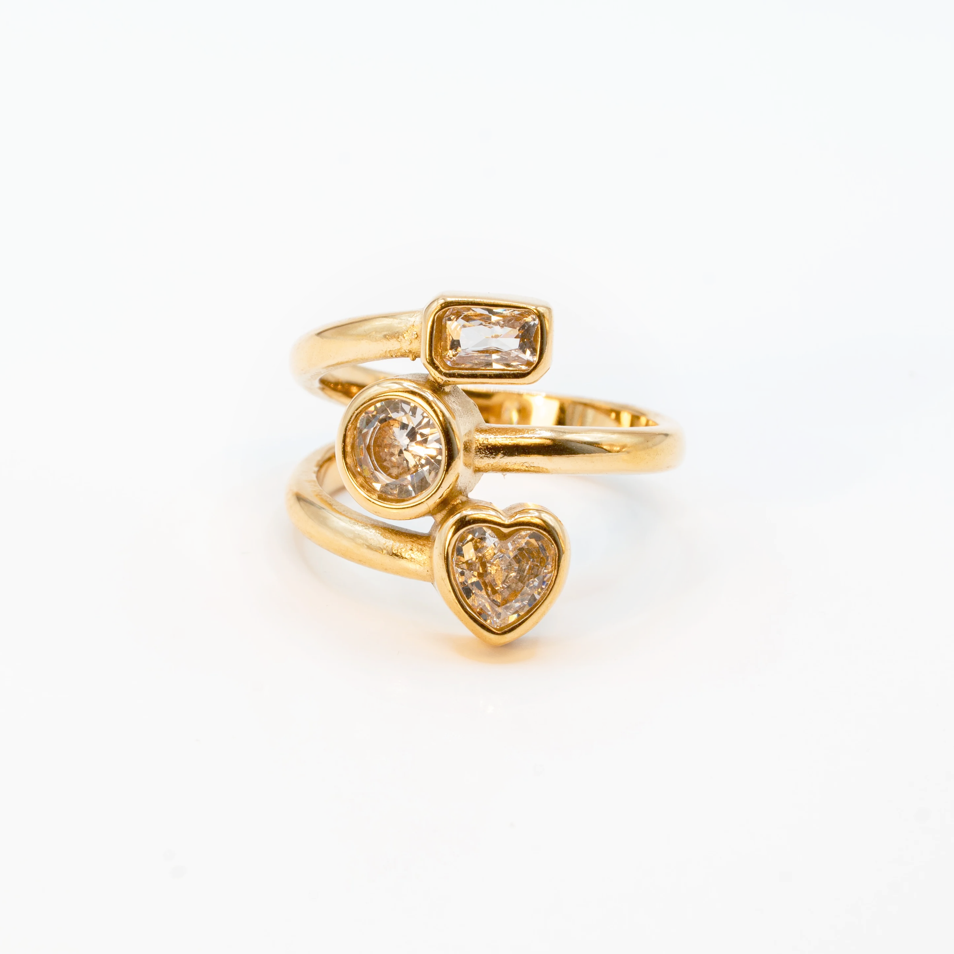 Verspielter Statement-Ring mit drei funkelnden Steinen in Herz-, Quadrat- und Ovalform. Der stapelartige Look wirkt modern und feminin – perfekt solo oder im Mix mit zarten Ringen. Gefertigt aus hochwertigem Edelstahl 316L und mit 18K Gold veredelt – wasserresistent und hypoallergen.
