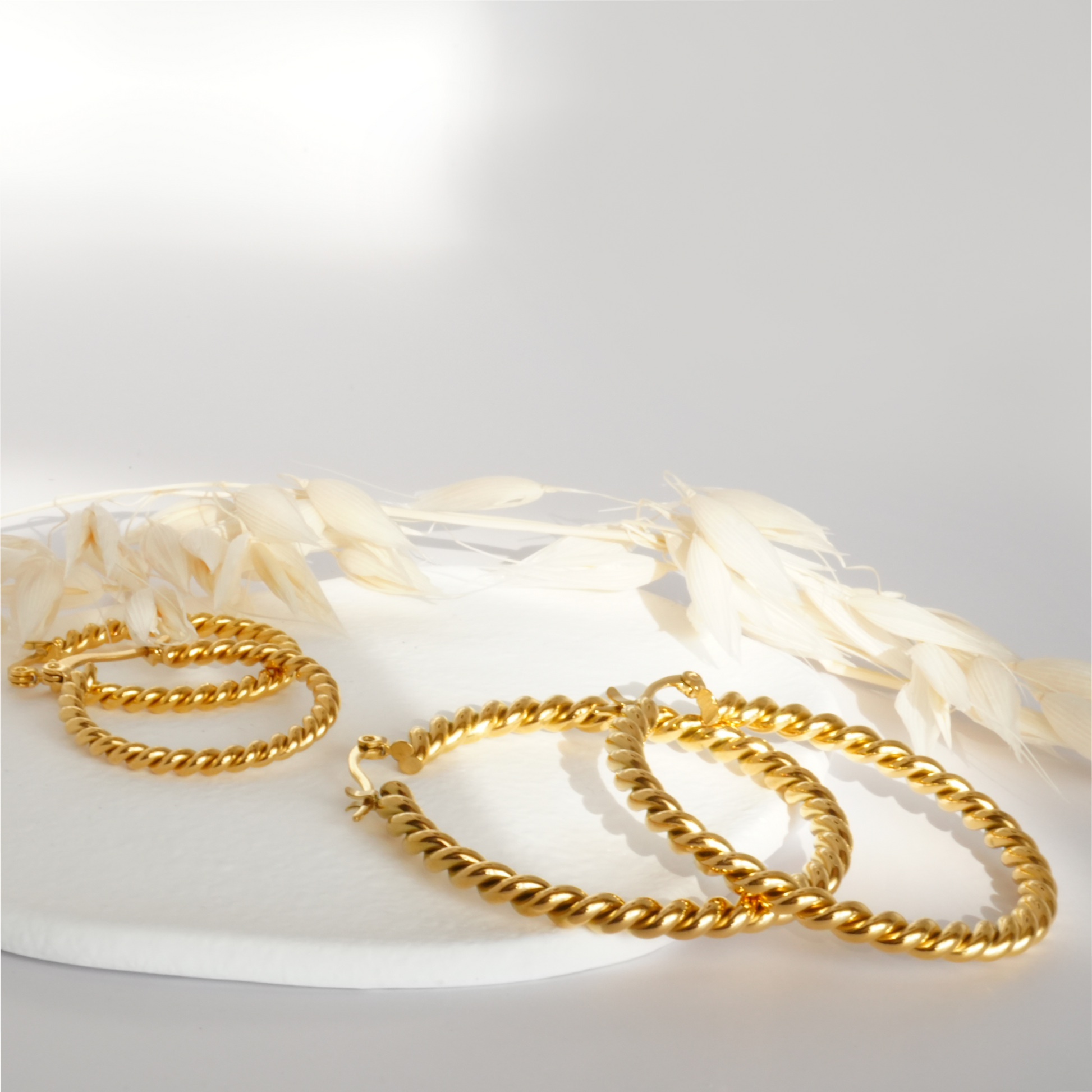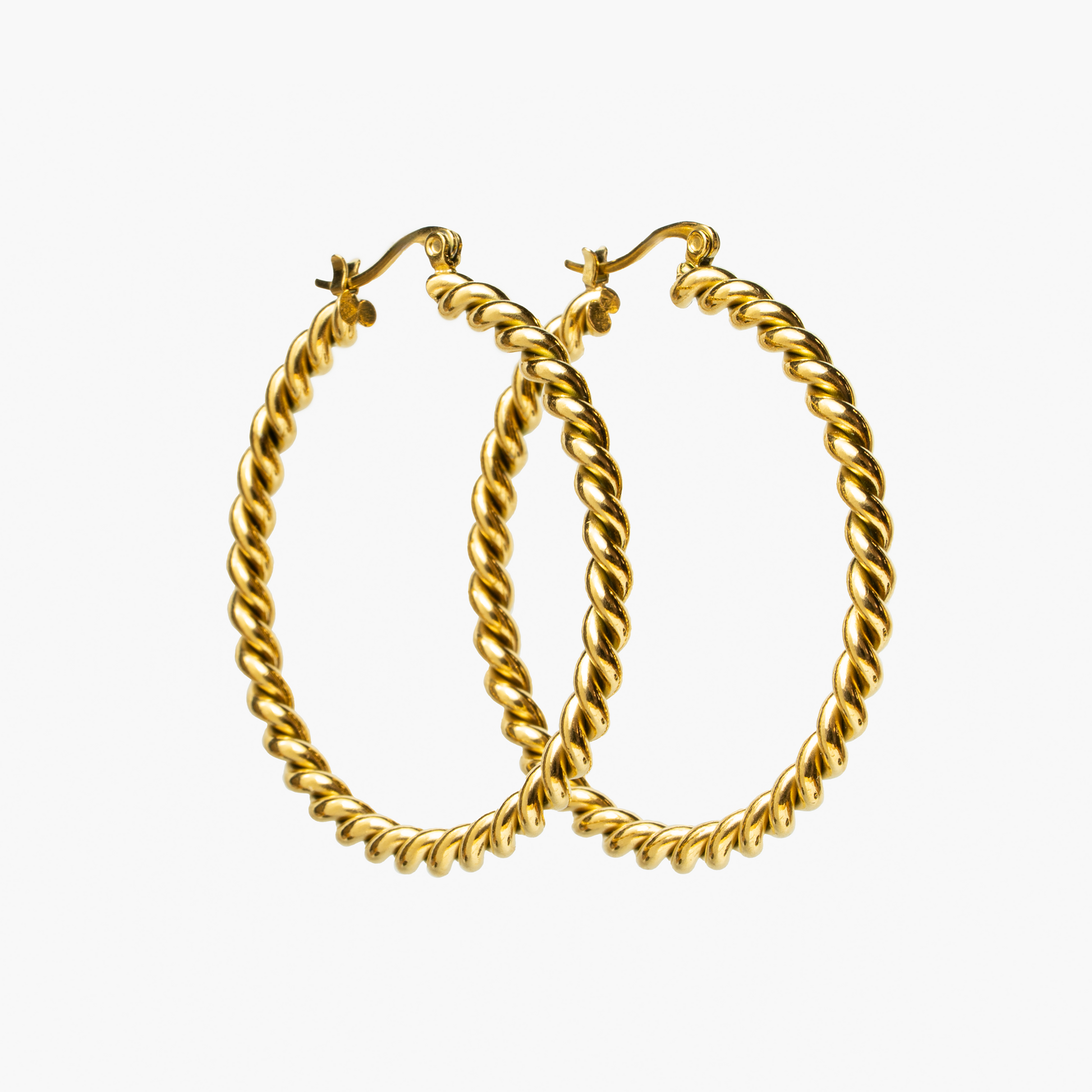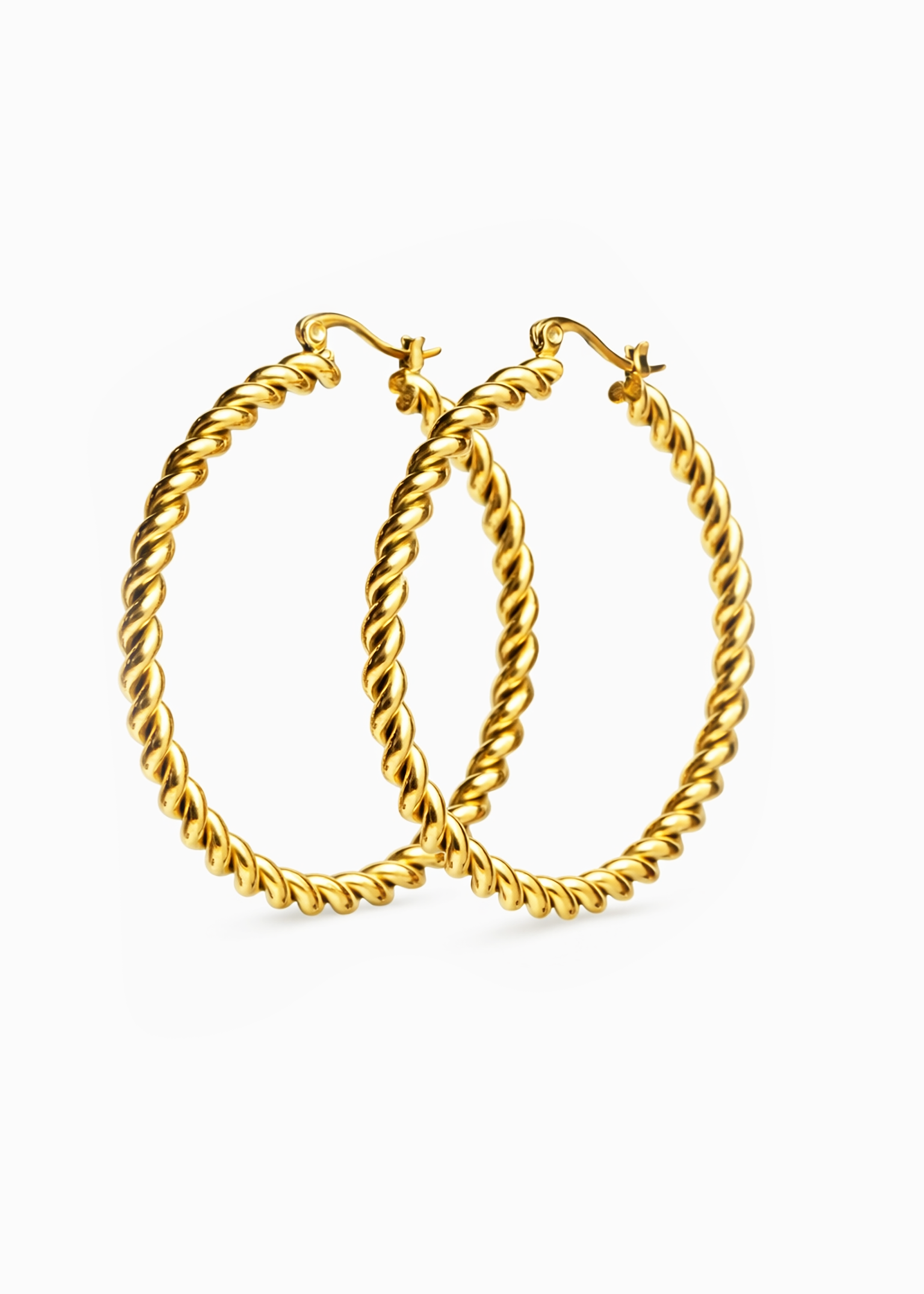 Statement-Creolen mit gedrehter Rope-Struktur: glänzend, auffällig und elegant. Gefertigt aus hochwertigem Edelstahl 316L und mit 18K Gold veredelt – wasserresistent, hypoallergen und perfekt für Abendlooks und besondere Anlässe.