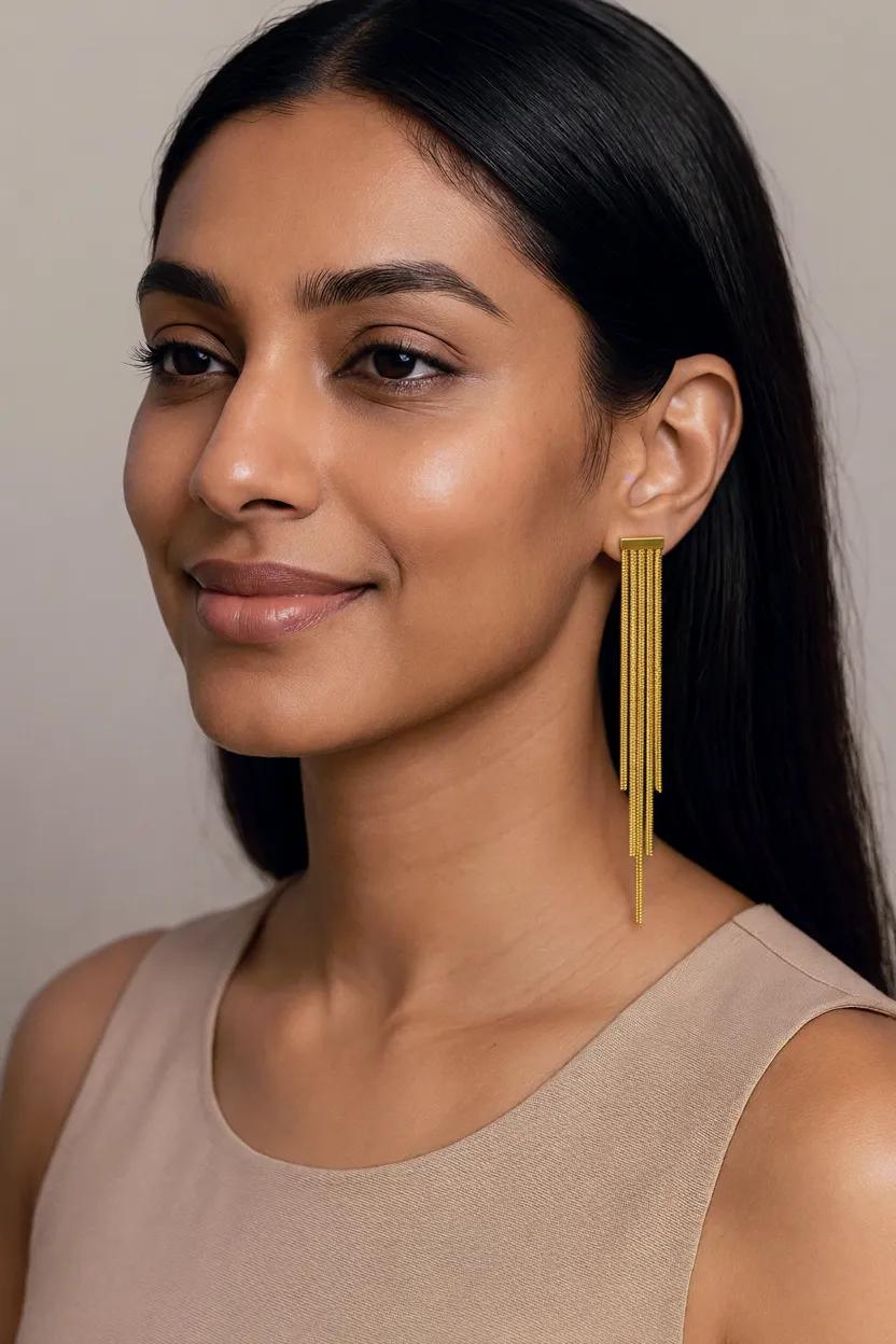 Mehrere zarte Kettenstränge bewegen sich sanft bei jeder Bewegung und verleihen dem Design eine elegante Leichtigkeit. Zeitlos, feminin und ausdrucksstark – perfekt für besondere Anlässe.