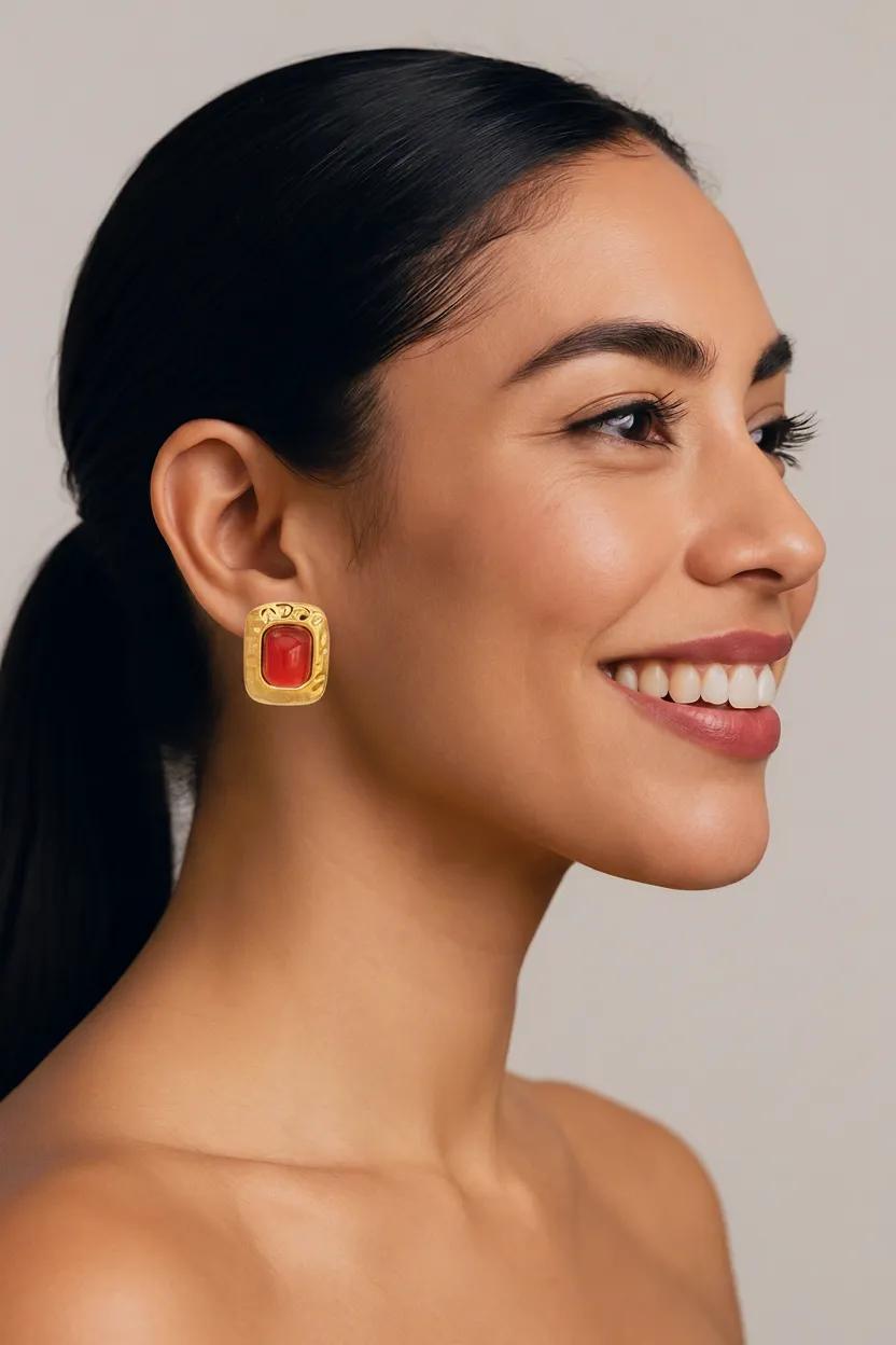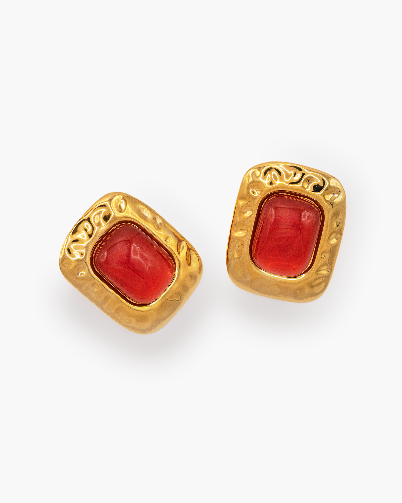 Ausdrucksstarke Ohrstecker mit warmer Eleganz und modernem Charakter. Die weich modellierte, goldfarbene Fassung umrahmt einen tiefroten, sanft schimmernden Stein und verleiht dem Design eine edle, zeitlose Ausstrahlung. Die harmonische Kombination aus glänzendem Goldton und intensivem Rot macht diese Ohrringe zu einem stilvollen Blickfang – elegant, feminin und selbstbewusst.